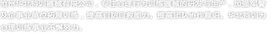 滄州華北特訓(xùn)器械有限公司成立于2002年,是專業(yè)研發(fā)生產(chǎn)心理行為訓(xùn)練器械、拓展器械、拓展器材、攀巖、兒童拓展器械的專業(yè)型企業(yè),并通過(guò)ISO-9001質(zhì)量管理體系認(rèn)證及ISO-14001環(huán)境管理體系認(rèn)證,致力于各職業(yè)群體提供的心理行為訓(xùn)練器械、拓展器械、攀巖、兒童拓展器械等設(shè)備,使之不斷提升心理健康水平、充分開(kāi)發(fā)自我潛能。我公司竭誠(chéng)為廣大客戶提供專業(yè)化各類心理行為訓(xùn)練器械相關(guān)產(chǎn)品和服務(wù)。